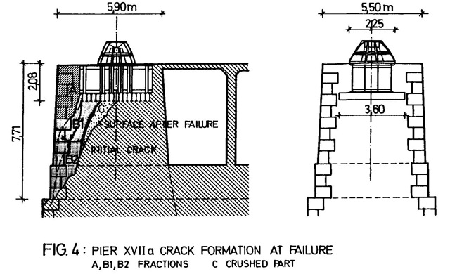 – creep : 교각은 무근 콘크리트 코어에 화강암 외벽을 입힌 구조인데, 수십 년에 걸쳐 콘크리트에서 크리프 현상이 발생하자, 하중이 크리프가 없는 단단한 화강암 외벽 쪽으로 점차 재분배됨. 이 과정에서 발생한 수직 인장력(splitting forces)이 콘크리트 코어 내부에 균열을 일으켰고, 이로 인해 지지력이 점차적으로 약화