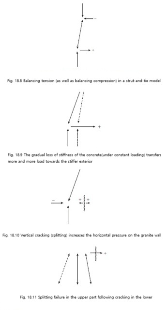 그러나 화강석 벽체는 수평 방향 강도가 거의 없기 때문에, 하중은 결국 남아 있는 두 개의 건전한 스트럿으로 재분배된다. 이로 인해 수직 압축력은 증가하는 동시에 평형 조건도 변화하게 된다. 즉, 내부 경사 스트럿은 기존과 같이 압축이 아닌 상부에서의 수평 인장력으로 평형을 이루어야 하는 상태가 된다. 이러한 변화는 결국 상부에서도 splitting 파괴를 유발하게 된다(Fig. 18.11)