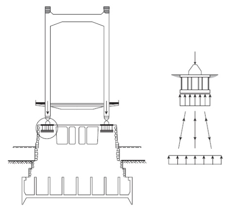 주탑에서 전달되는 수직 하중은 교각 내부로 분산되어 내려가며, 이를 모델링하면 하향 및 외측으로 향하는 경사 압축대(strut)로 나타낼 수 있다. 이 경사진 압축력이 유지되려면 하부에서 수평 방향으로 잡아주는 힘인 수평력(tie)이 필요한데, 교각 내부의 무근 콘크리트 코어가 수평 인장력을 받아 이 균형을 유지한다. 그러나 초기 단계에서는 스트럿의 경사가 작기 때문에 평형을 이루기 위한 수평력이 크지 않아, 무근 콘크리트도 이 인장력을 견딜 수 있다. (Fig. 18.8)