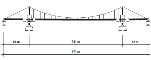 아이바 체인(eye bar chain)의 rocker tower(교량의 주탑이 기초에 고정되지 않고, 하부의 힌지 또는 핀 베어링을 통해 종방향으로 자유롭게 기울어질 수 있도록 설계된 구조)를 적용한 현수교이며 지반조건으로 인해 자정식(self-anchored) 현수교로 설계됨. 자정식 설계를 구현하는 과정에서 보강 거더를 교각에 힌지로 연결하여 독특한 정역학 시스템을 구축, 핵심 부재 하나라도 파손되면 교량 전체가 붕괴되는 구조적 취약성을 가지고 있었음 - 사고의 근본 원인